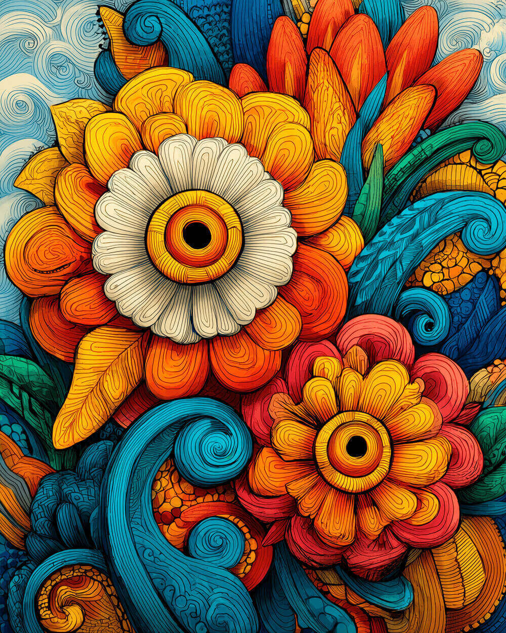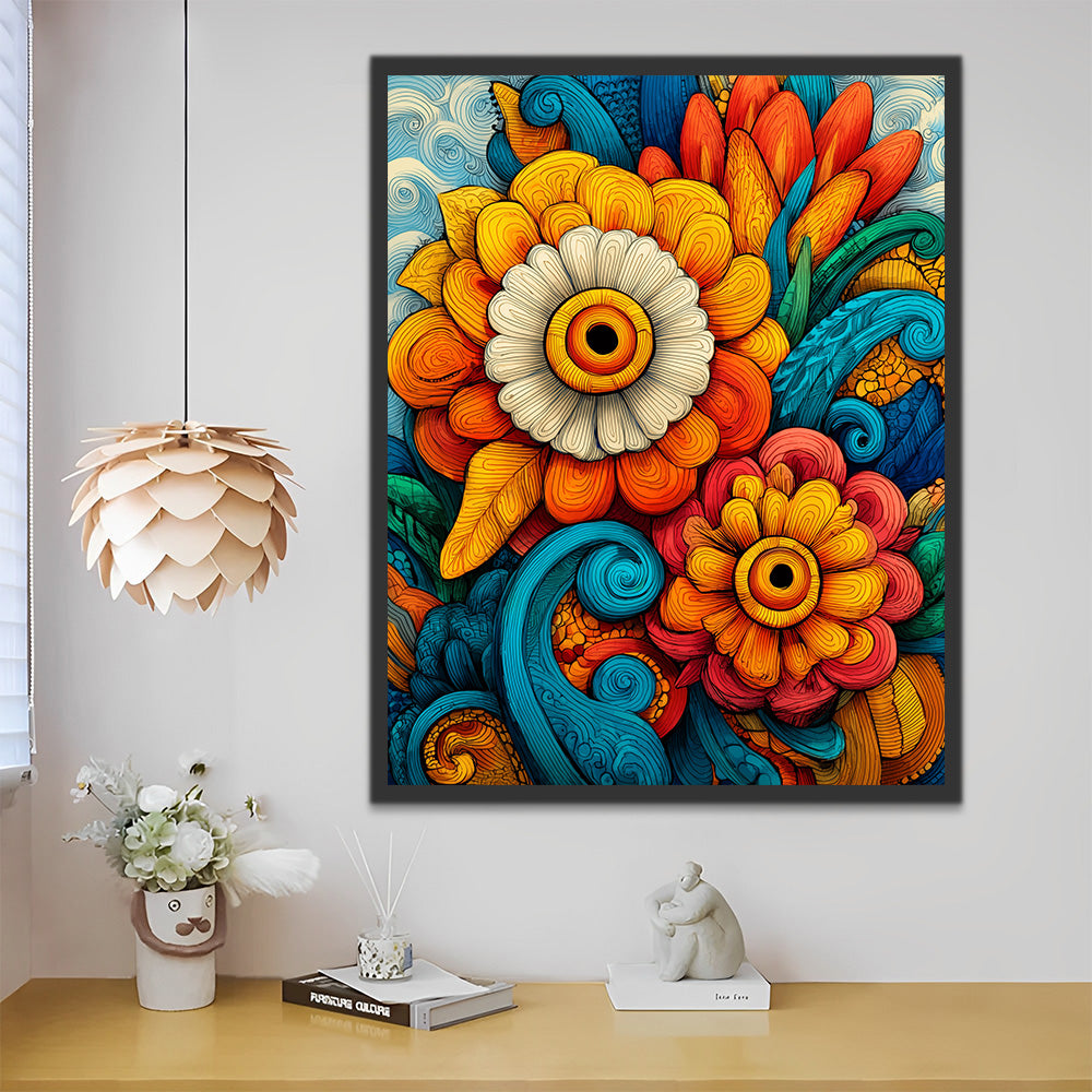 Abstract Twisted Colorful Chrysanthemums and Leaves Paint by Numbers