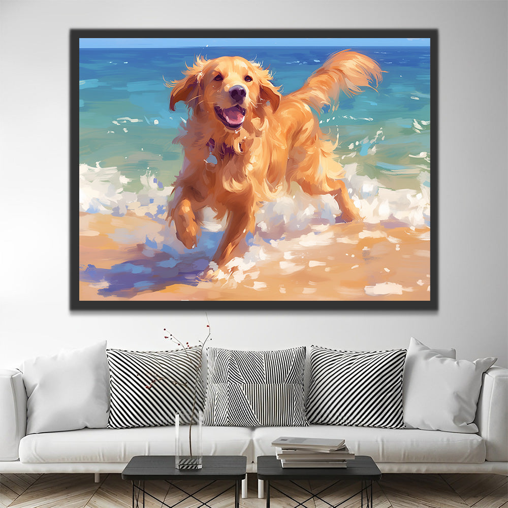 Happy Golden Retriever Playing in the Sea Water Paint by Numbers