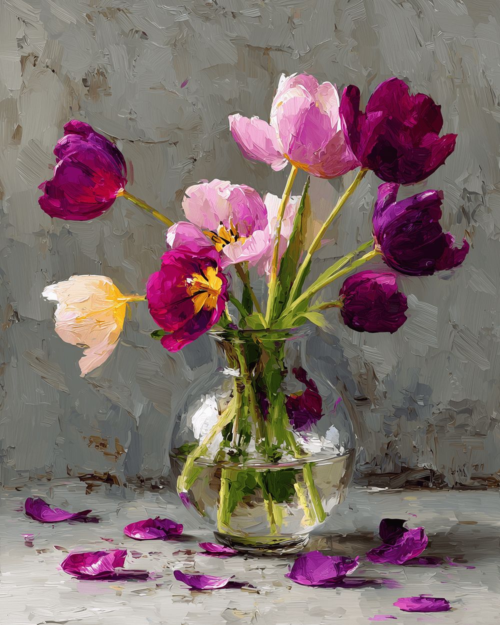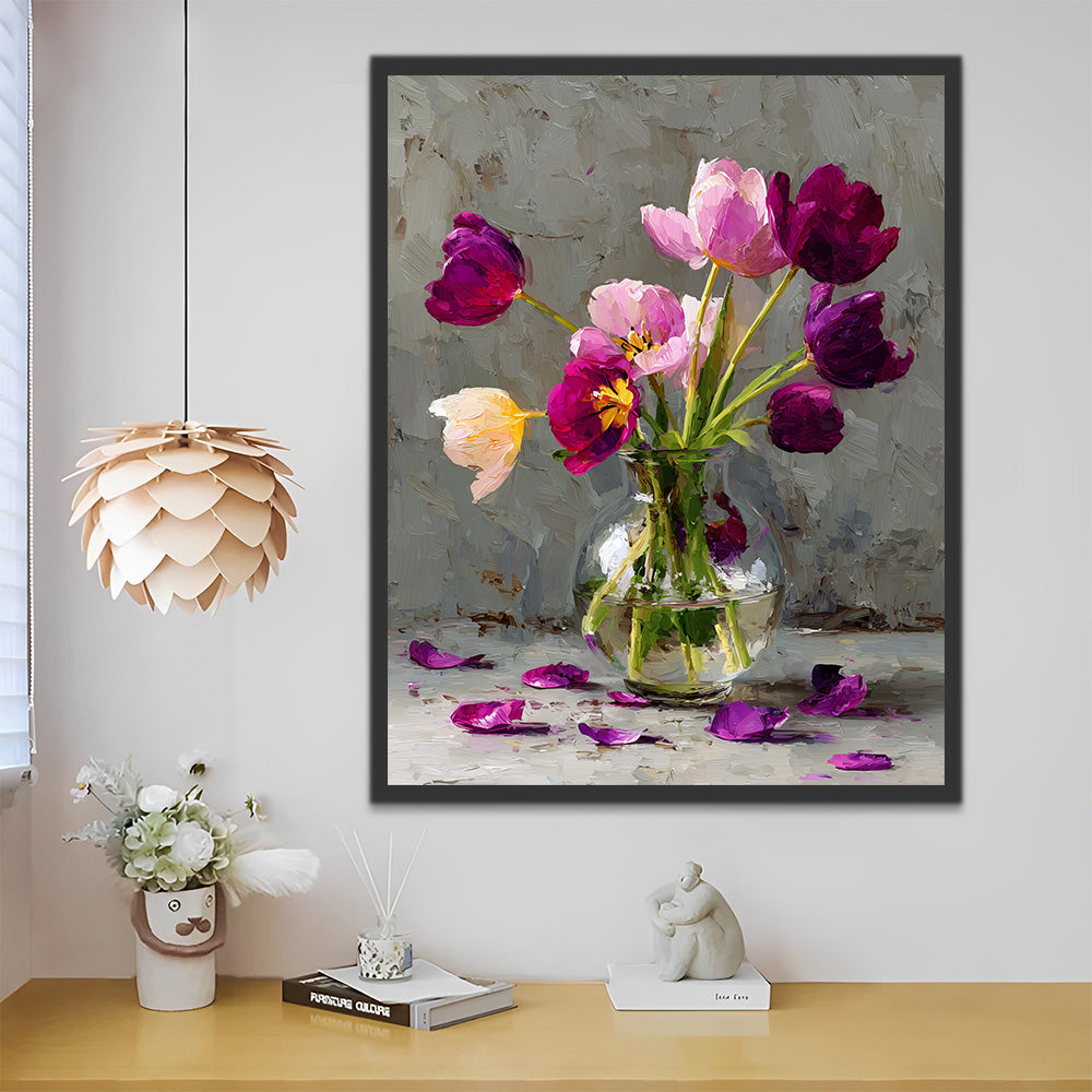 Pink and Purple Tulips in the Transparent Glass Vase Paint by Numbers