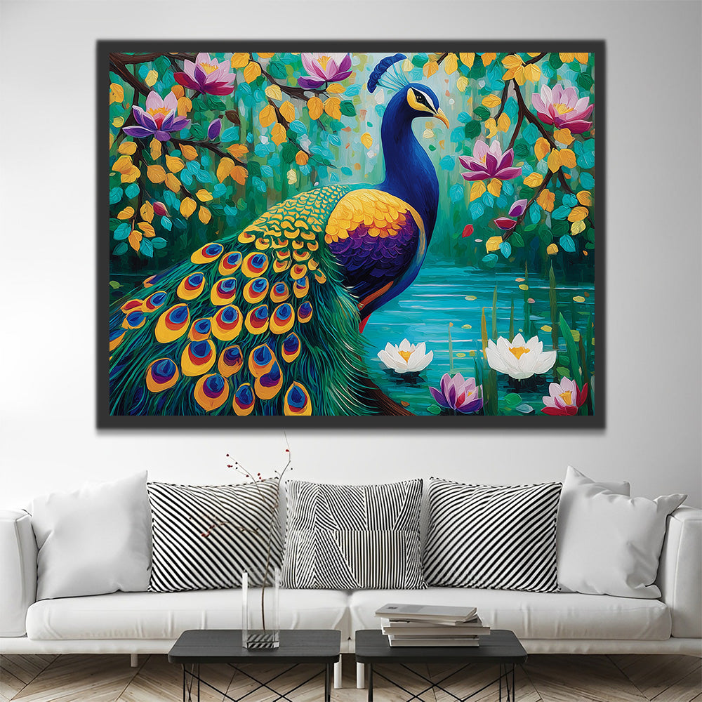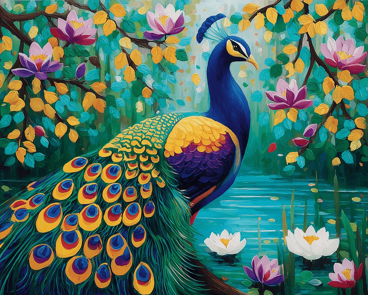 Golden Green Peacock beside Lotus Pond Paint by Numbers