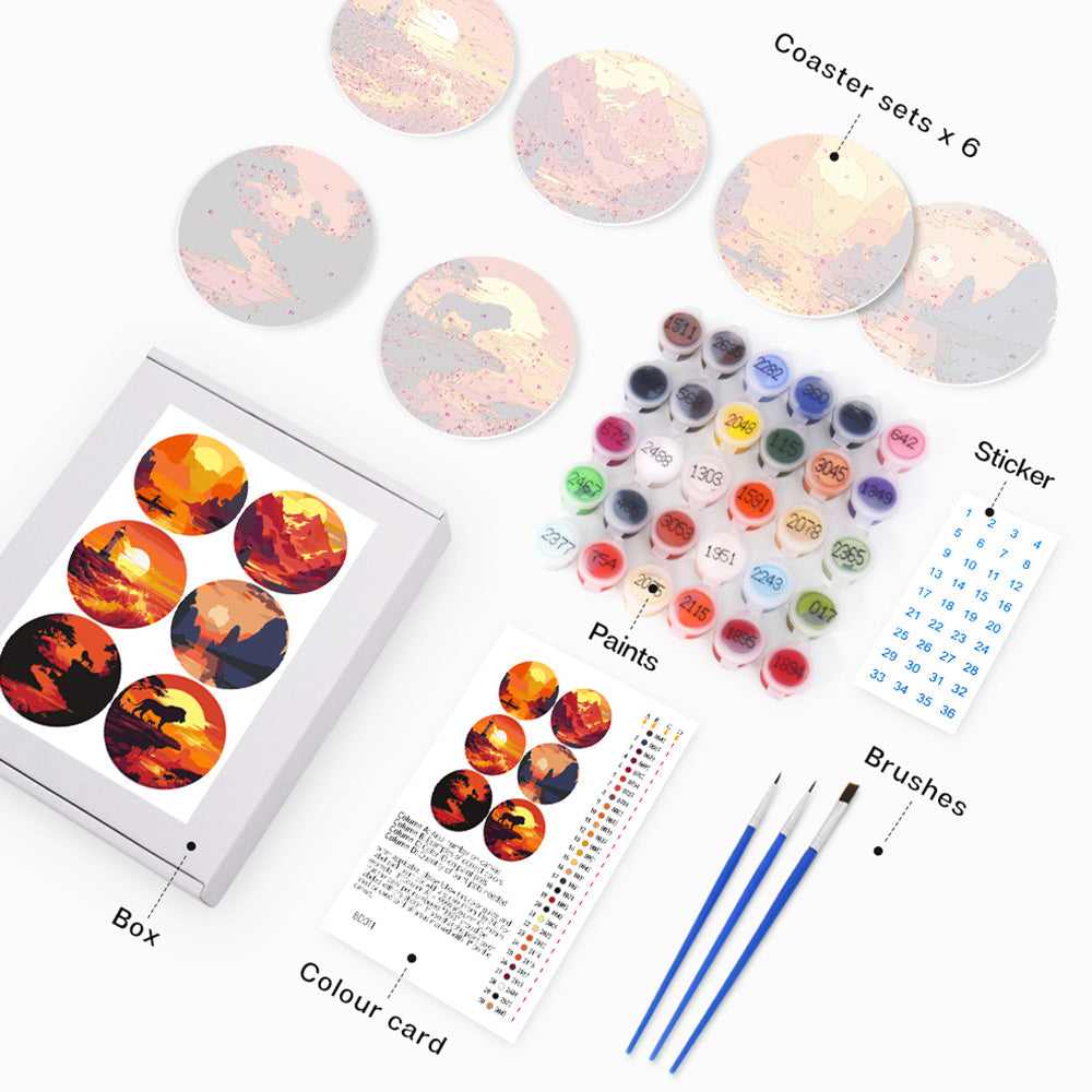 6Pcs Sunset Mountains and Lighthouse Coasters Paint by Numbers