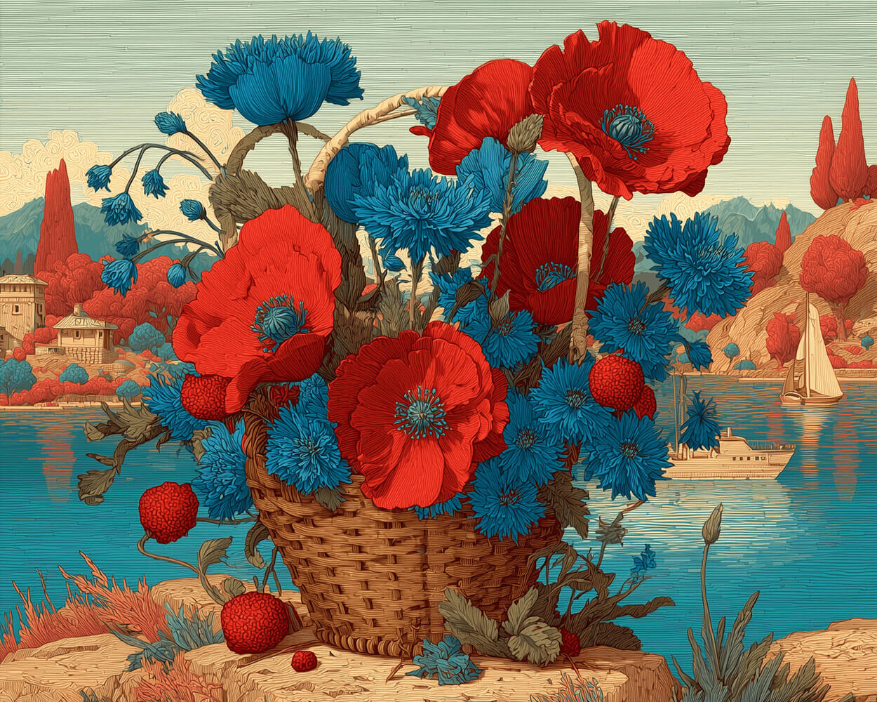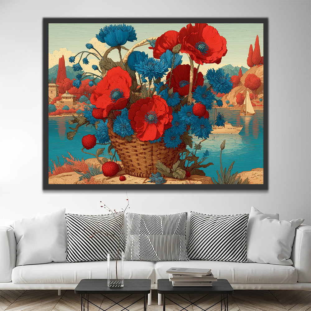 Basket of Blue Chrysanthemums and Red Poppies by the Lake Paint by Numbers