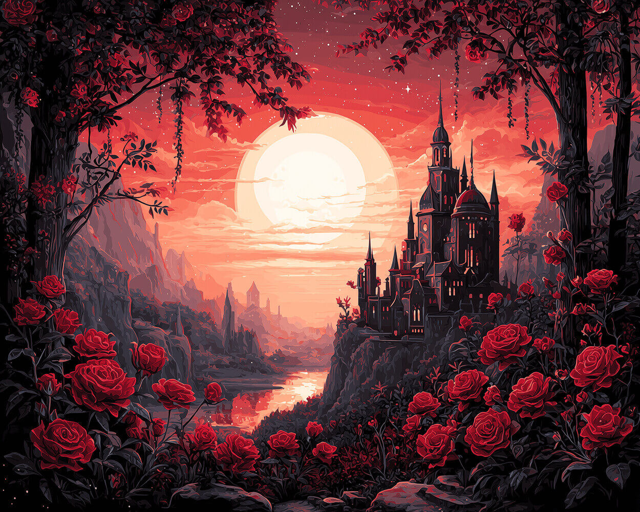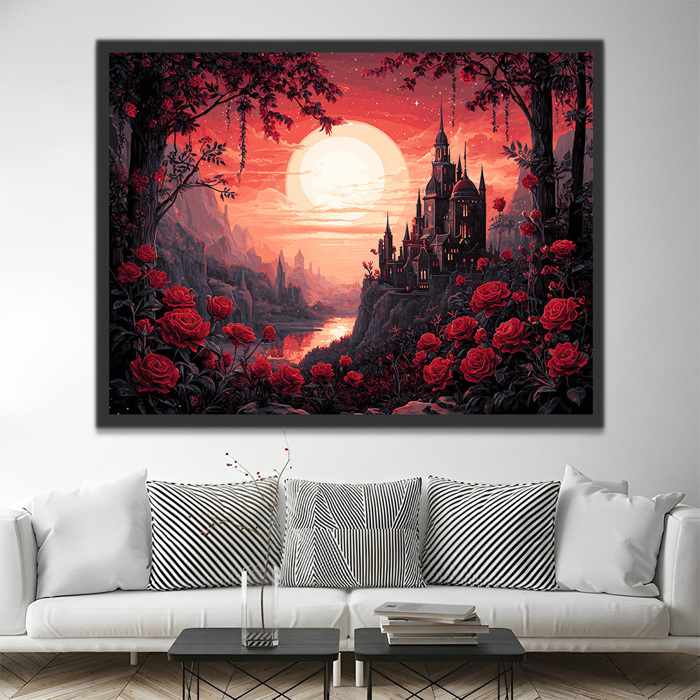 A Mountain Castle filled with Red Roses Paint by Numbers